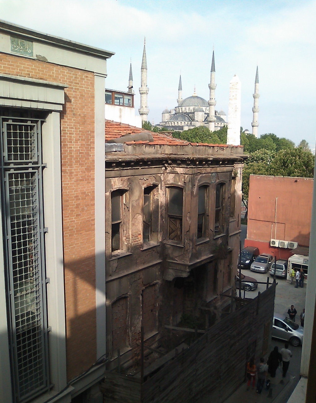 ↑ホテルの部屋から廃墟越しのブルーモスク