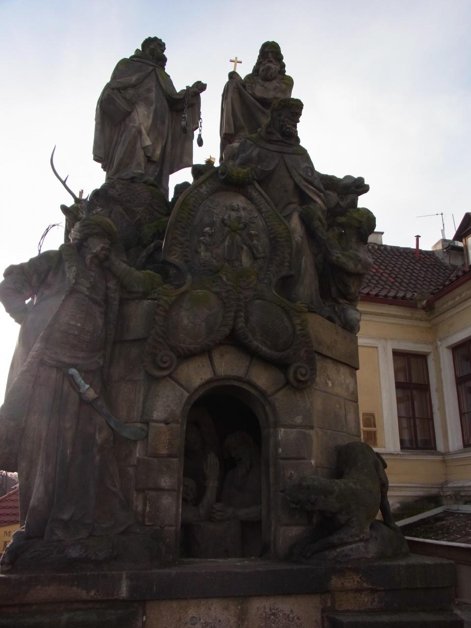 橋には30体の聖人の彫刻が並んでおり、旧市街側からみて右側の8番目のカトリックの聖人ヤン・ネポムツキー像の基部にあるネポムツキーのレリーフに触れると幸運が訪れると言われ、多くの人に触られたため、つるつるになっていました。