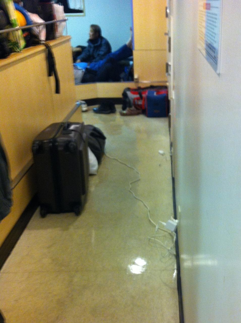 ココは、おがさわら丸、Cデッキの一番後ろの端。壁にあるコンセントは「超たこ足」状態。みんなが持ち寄った3股コンセントがぶら下がっています。