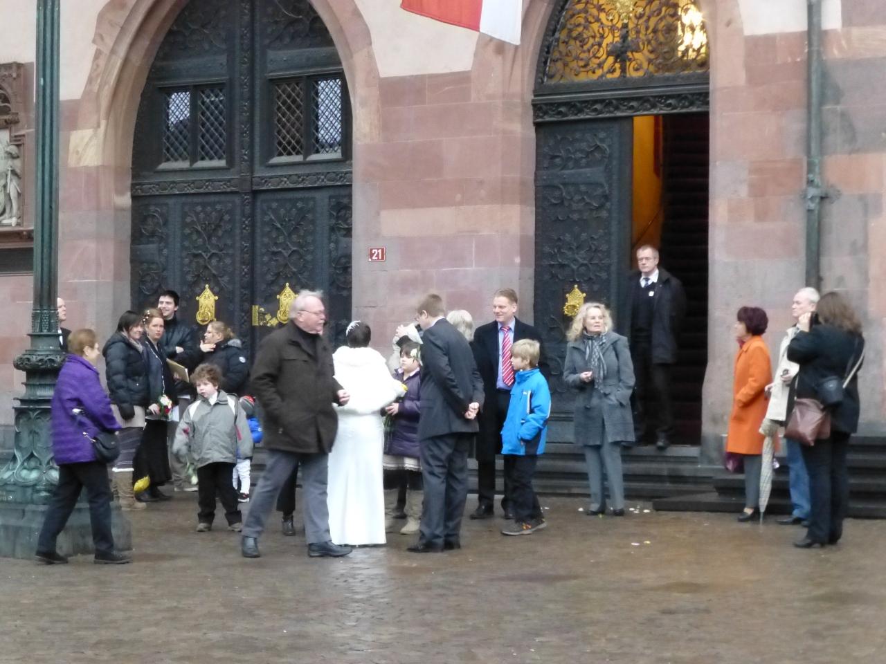 ちょうど結婚式をあげるカップルが建物の入口から出てきました。この建物の中で、結婚式をあげ婚姻届を出すこともできるそうです。