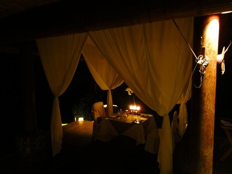 しかし、周りは虫の音だけ、明かりはキャンドルのみで猿とか襲ってこないか