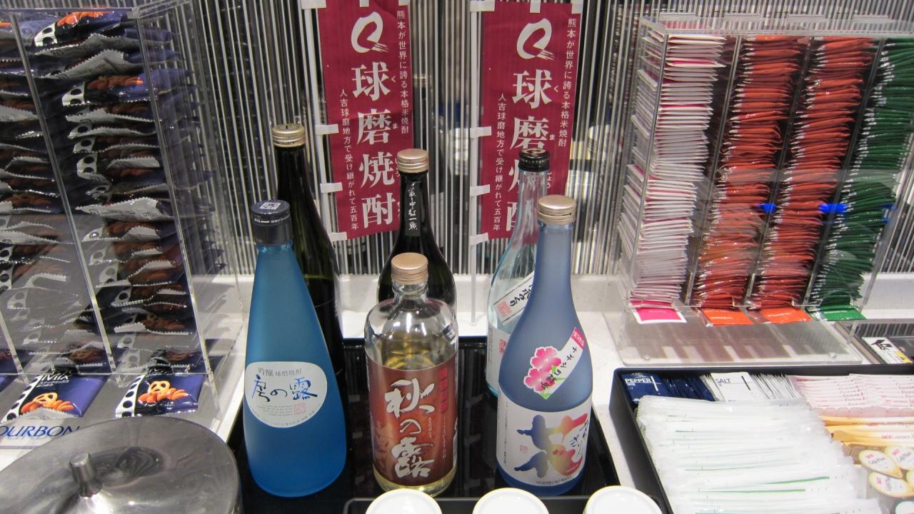 ANAラウンジに入ったら、6種類の球磨焼酎が飲み放題でした。