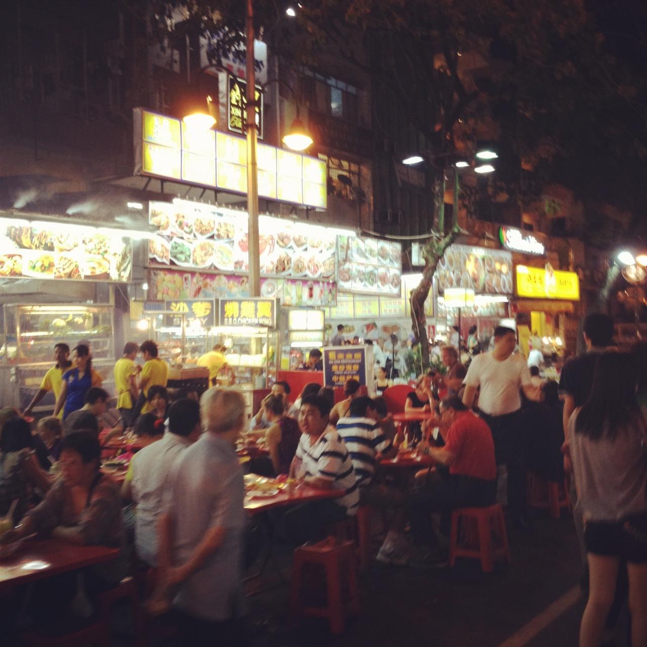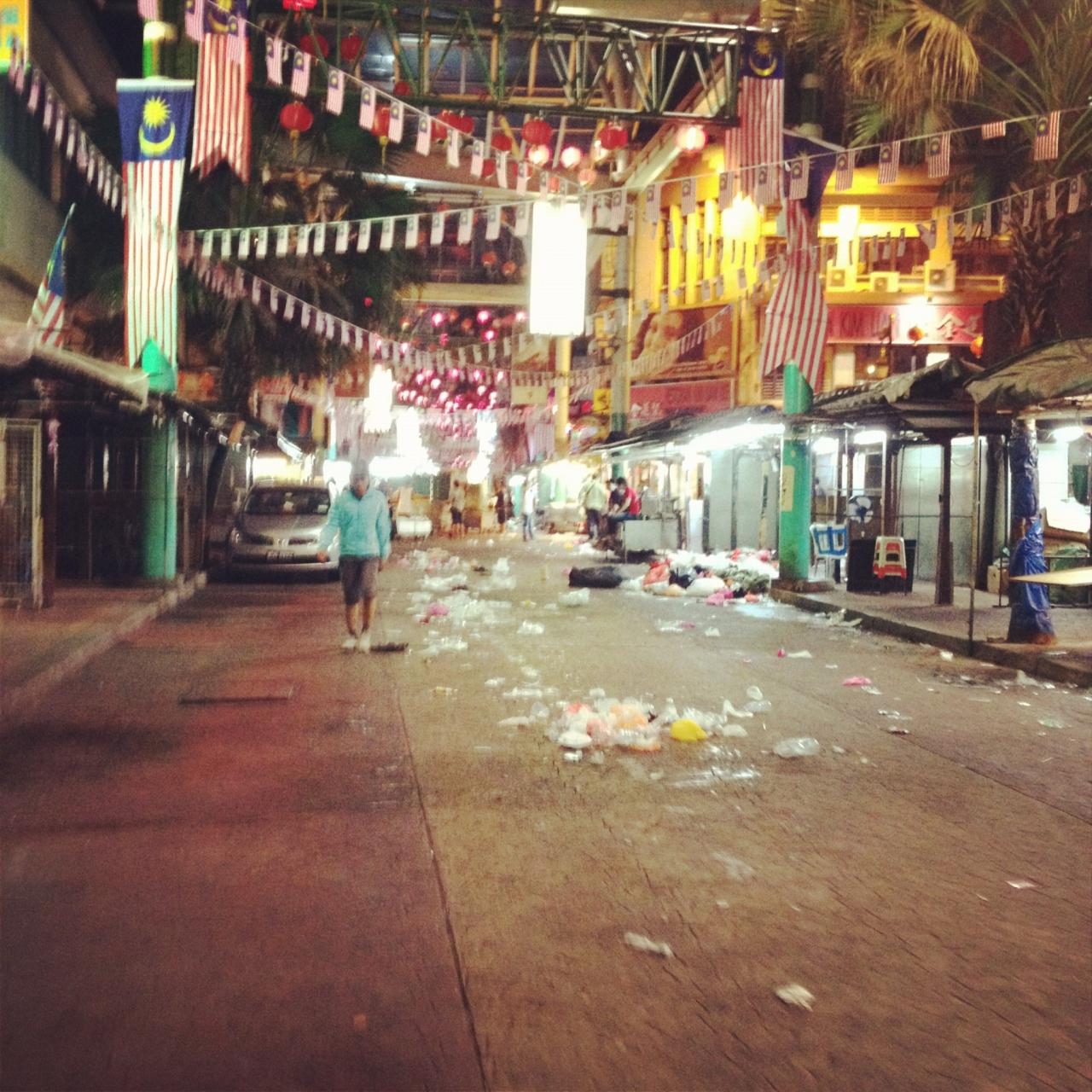 夜遅くのチャイナタウン、昼は人、移動式の店でうまってますが夜は閑散としてます。東南アジアって感じで最高!