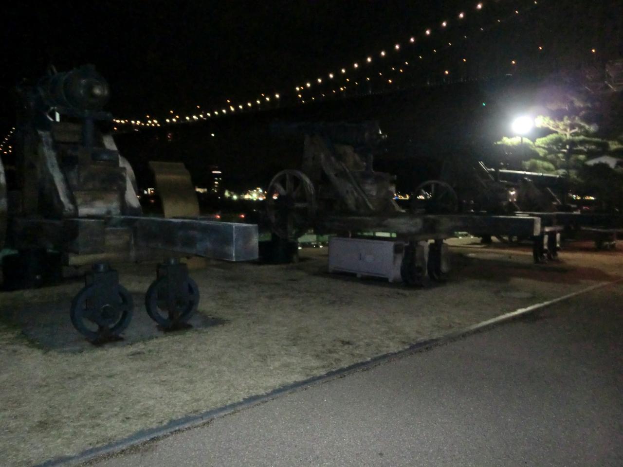 関門橋です。夜だから良く分からないかもしれませんけど。関門橋の下では釣り人たちが釣りをしていました。あ、あと、釣り人に囲まれながらカップルがイチャイチャしてました。面白かったです。