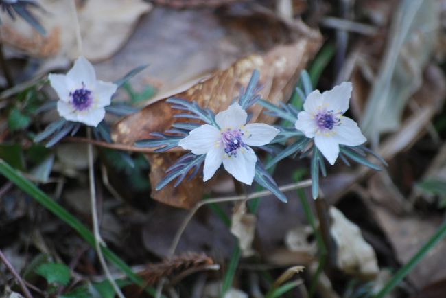 ここでは約45分間の間に、城山登山口へ行く途中のニリンソウ、カタクリ、アズマイチゲの自生地で節分草を見つけることができた。 また、城山登山口付近の墓地でもかなりの節分草を見つけることができた。