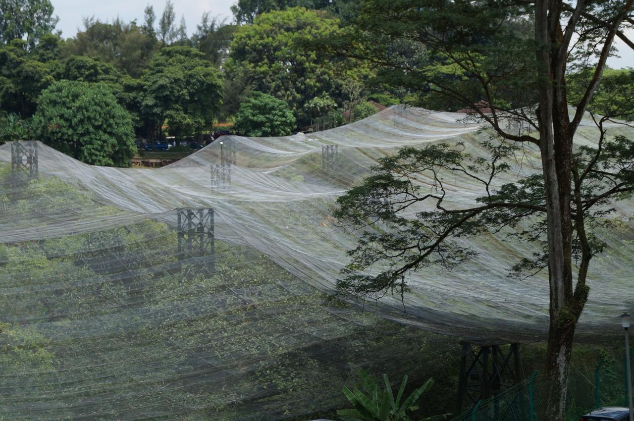 バードパークの外観。屋根がネットで覆われている大きな鳥かご。