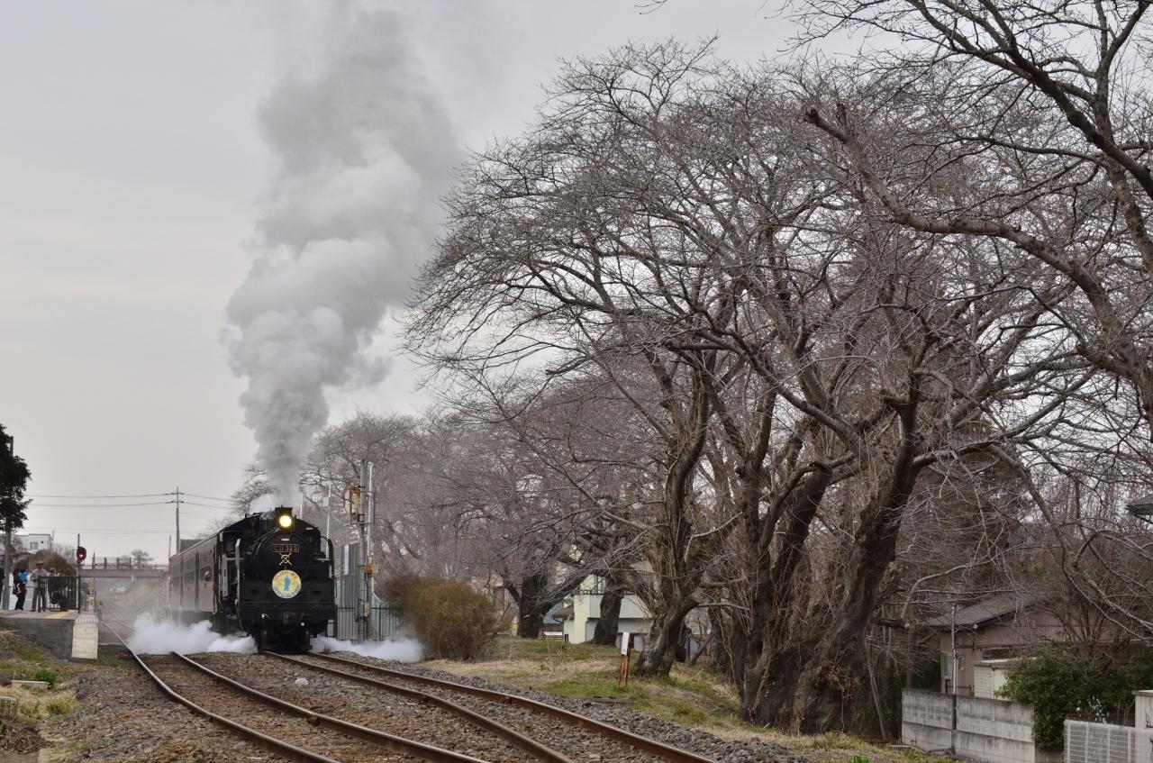 また返しの下館行きにおいてニュースでも大騒ぎになった、強風の影響で煙霧が発生しました。ここの撮影場所は畑の中にあるポイントなので、風の影響で砂ホコリが発生し大変でした。SLが通過する時間帯は風が弱ったですが、空がかなり暗くて露出の設定に苦労しました。