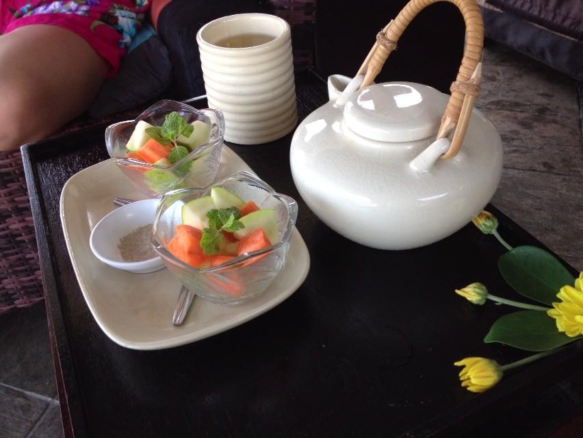 施術後にフルーツとにんじんと生姜茶が出されました。なんだかとても健康になった気分に。