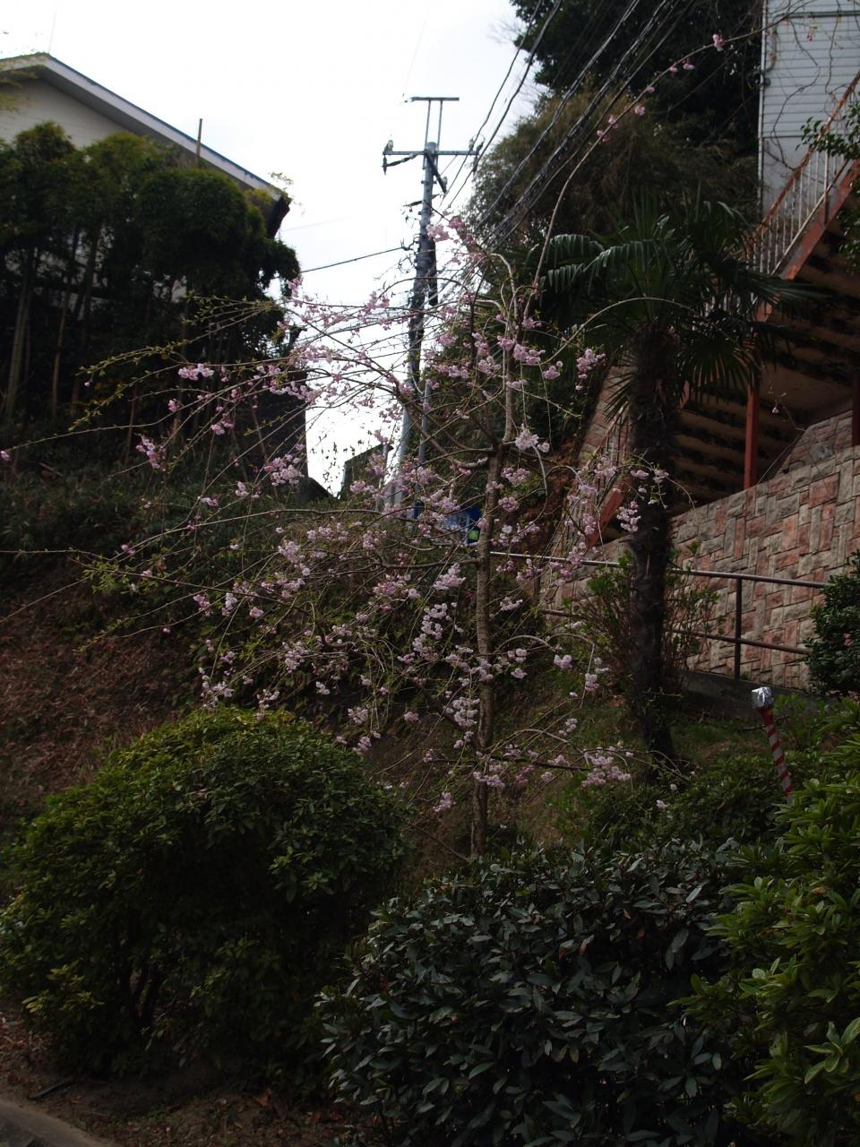 公田ハイツ(公田町)の枝垂れ桜。崖上にL字に5本植えられている。