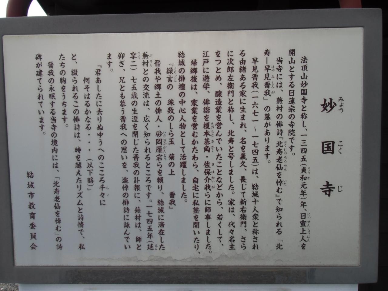身延山を本山とし、南北朝時代の14世紀中頃に日宣上人を開山とする日蓮宗の寺院で、与謝蕪村と交流のあった地元の文化人で俳人である早見普我の墓があります。