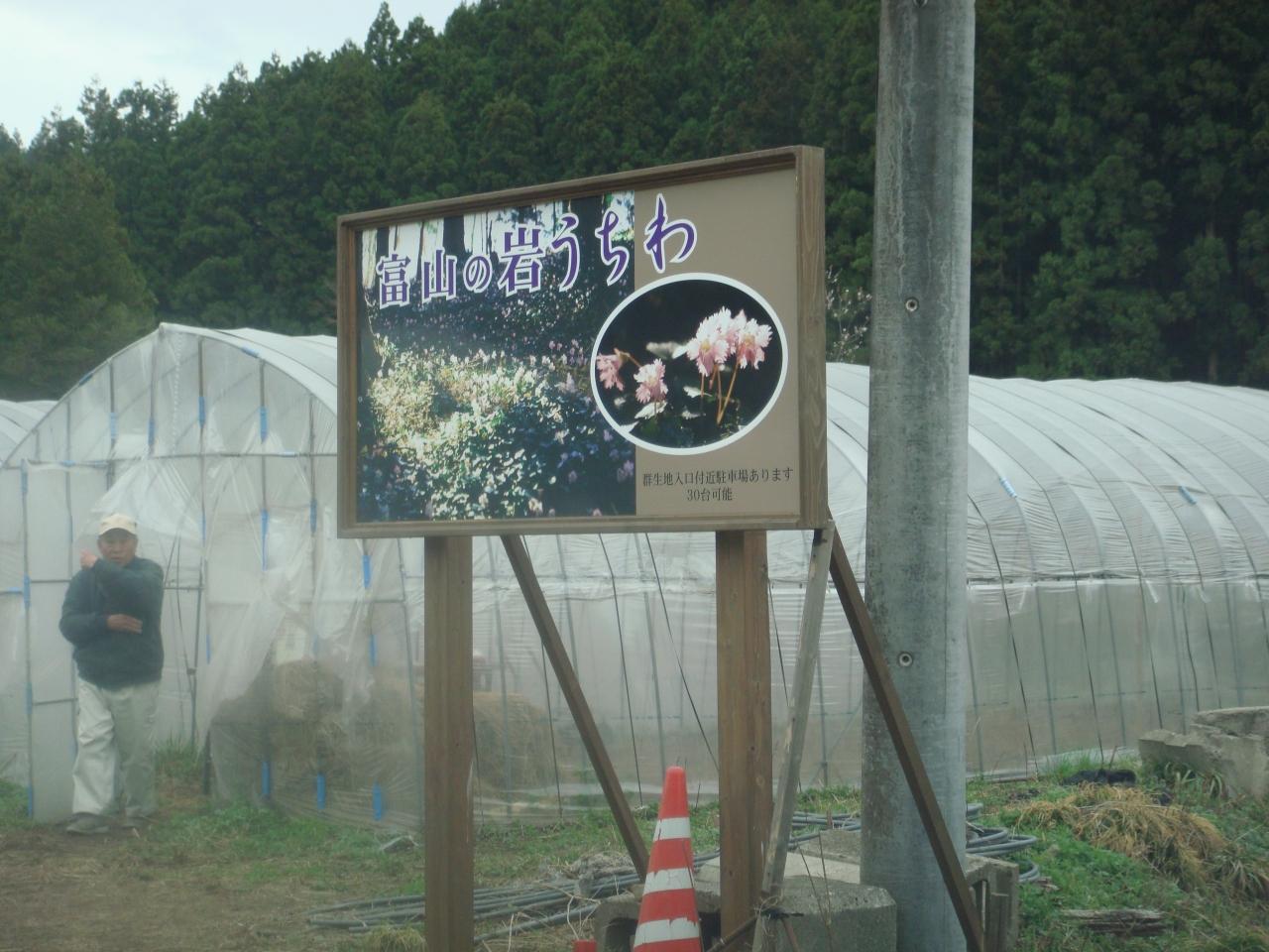 東側の道路へ入って、約120m位に右側に橋があります。ここで富山川に掛かる橋を渡る。と、ビニールハウスから人が出てきました。「何をしているんですか?」雨が降ってきたので雨宿りしていたそうです。“イワウチワ”の監視兼案内人でした。「車が少ないので現場までOK」と言われました。
