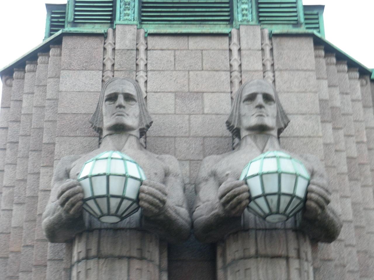 番人のような4体の男の人が特徴的な駅舎ですね。