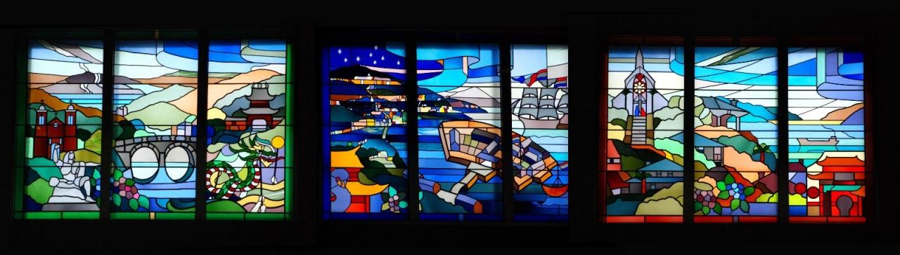 長崎駅改札口の上には観光名所を紹介したステンドグラスがあった