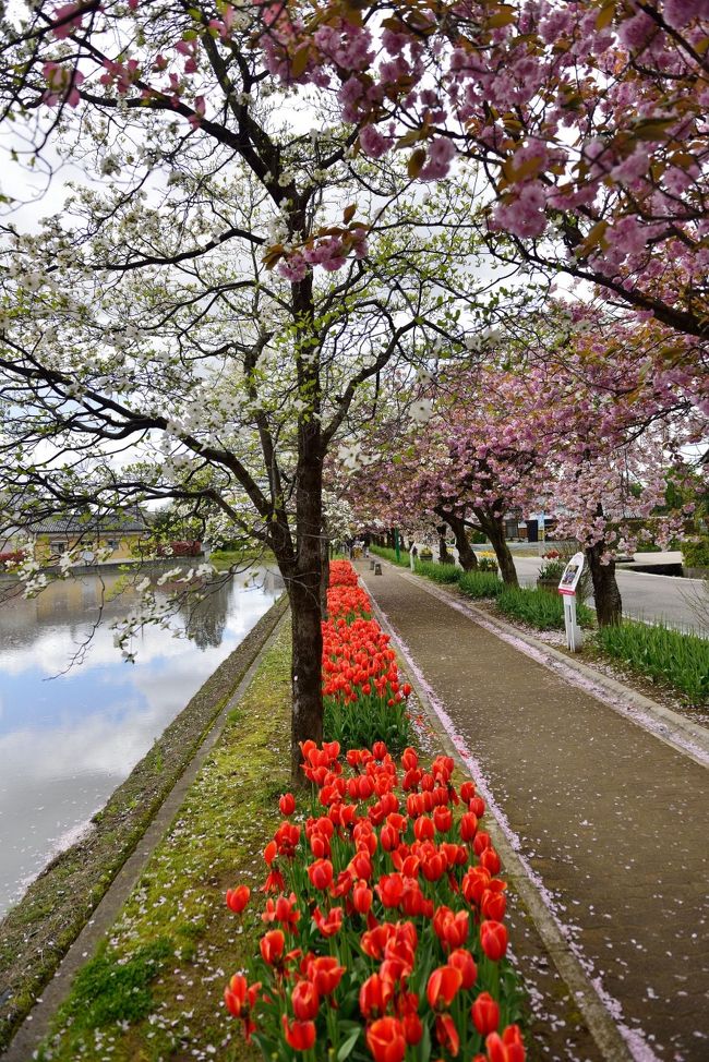 - これが砺波平野のチューリップですか? きれいですね。桜が同時に咲いているのにはびっくりしました。関西ではチューリップと八重桜は時期が全く違います。しかし富山とあれば納得がいきます。