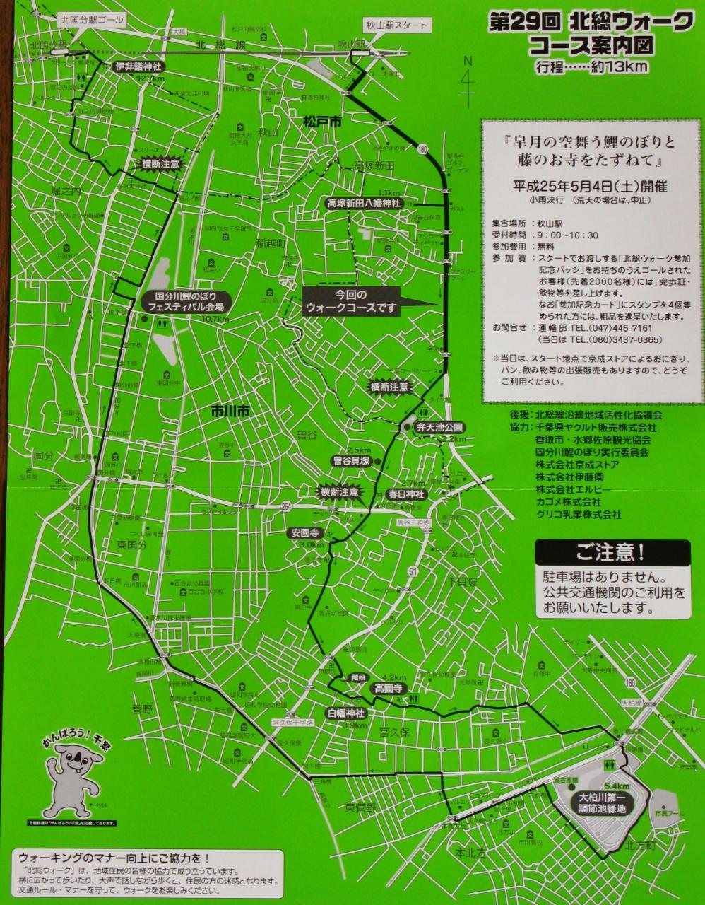 秋山駅(スタート) → 高塚新田八幡神社 → 弁天池公園 → 曽谷貝塚 → 春日神社 → 安國寺 → 白幡神社→高圓寺→大柏川第一調整池緑地→国分川沿いの鯉のぼり→伊弉諾神社→北国分駅(ゴール) 完歩証、粗品をプレゼント。