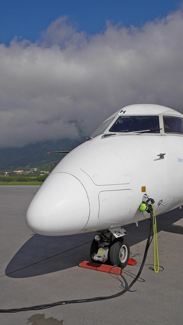 0828 空港内を10分近く走りやっと飛行機の前.ボンバルディアのDHC-8と同じ,こちらではDash-8と呼んでいる.チロリアン航空だ.LH便だがたしかオーストリア航空はルフトハンザの子会社になってしまったはずだ