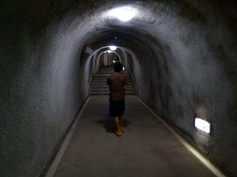 地下トンネルから螺旋階段を下り