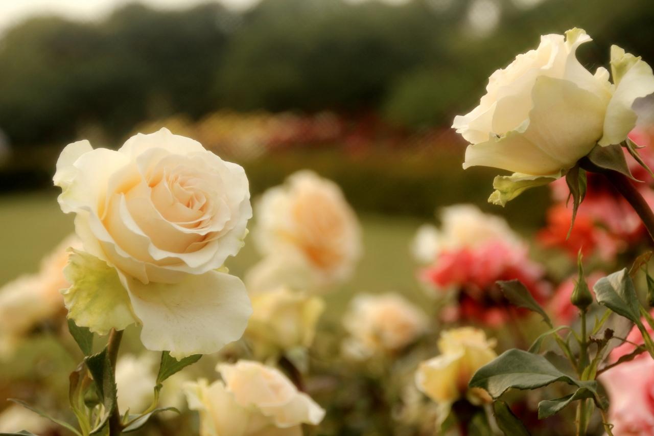 「初夏の緑と白とバラの季節の新宿御苑(後編)満開で熟女の彩り豊かなバラ園」