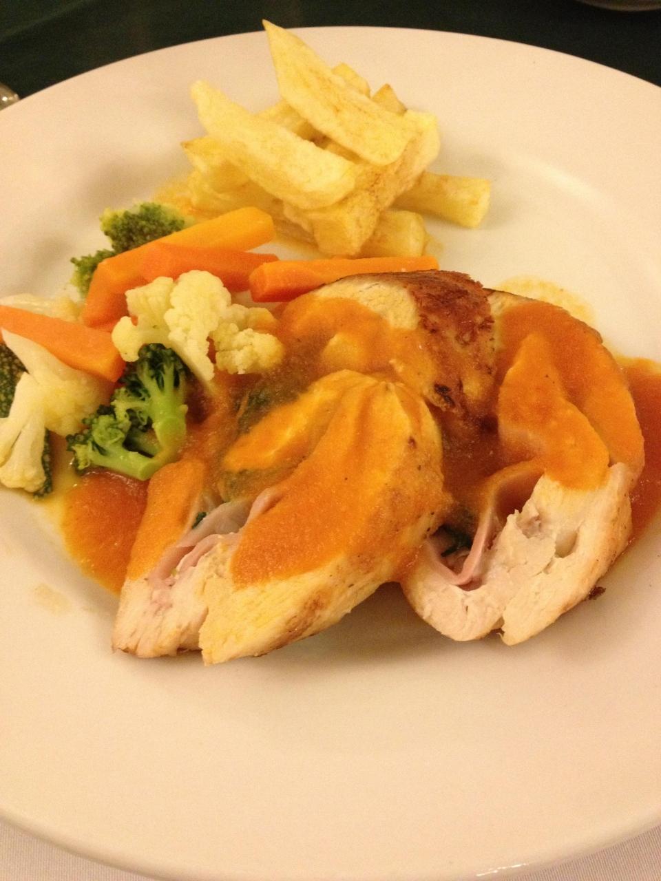 メインはチキンでハムやチーズをくるんだもの。これ何料理?