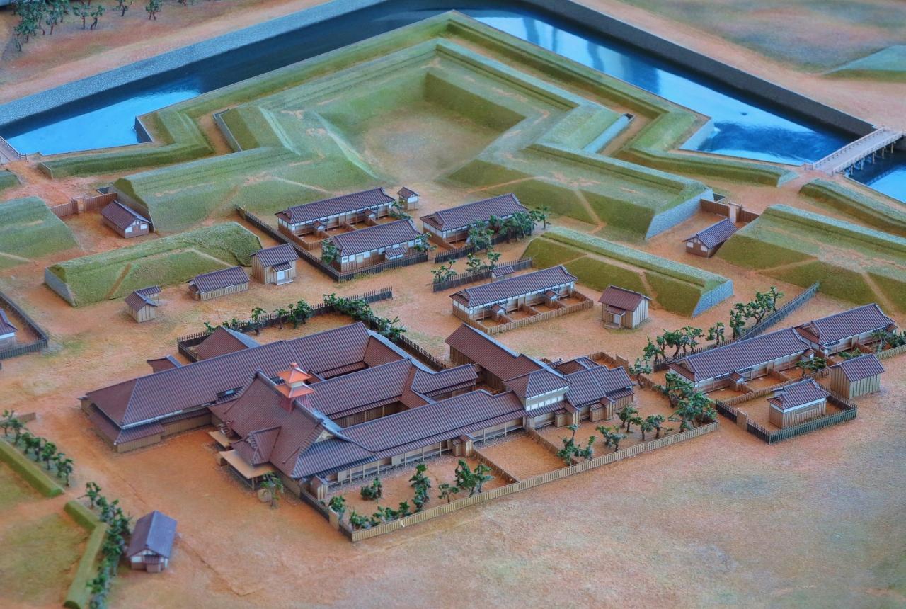 展望2階 : 五稜郭に関する展示スペース「五稜郭歴史回廊」を常設。その他に築造当時を再現した「五稜郭復元模型(1/250)」やブロンズ座像「土方歳三之像」がある。