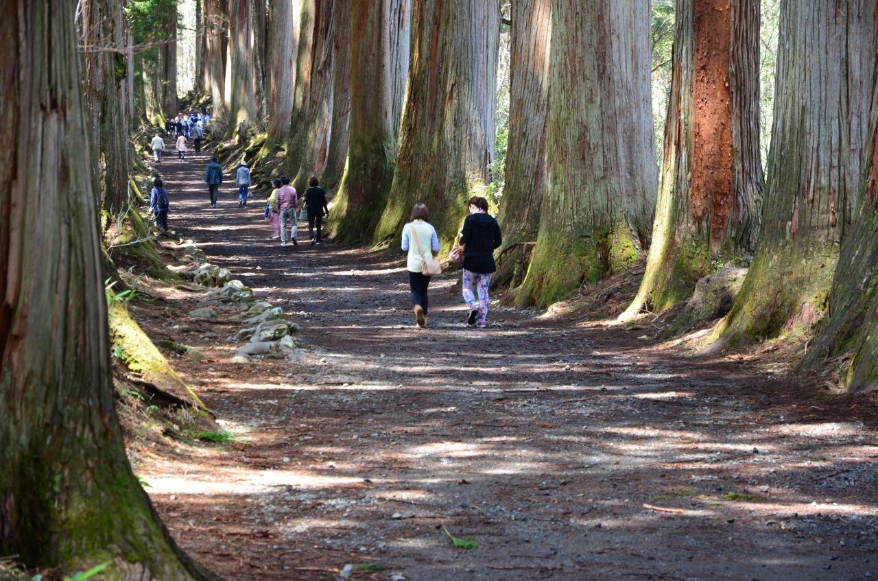 見上げても先端が見えないほどの高さと太い幹をもつ巨木が約300本も立ち並んでいて、それはもうすごい迫力。樹齢は400年にもなるそうです。