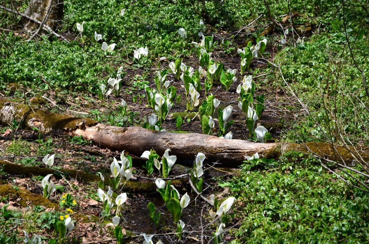 尾瀬のミズバショウは木道のみですが、ここは木の間にミズバショウが群生していて、また違っています。