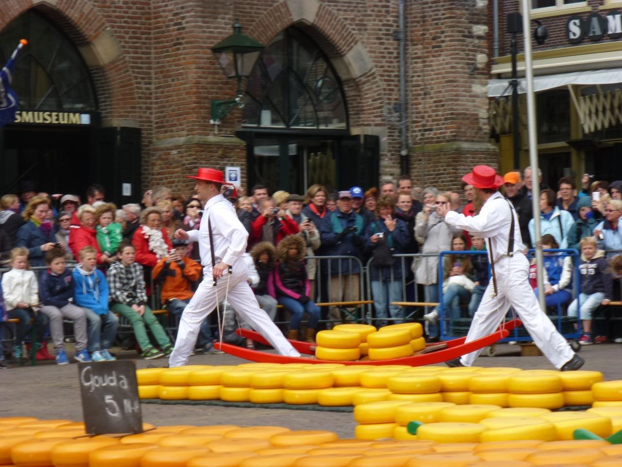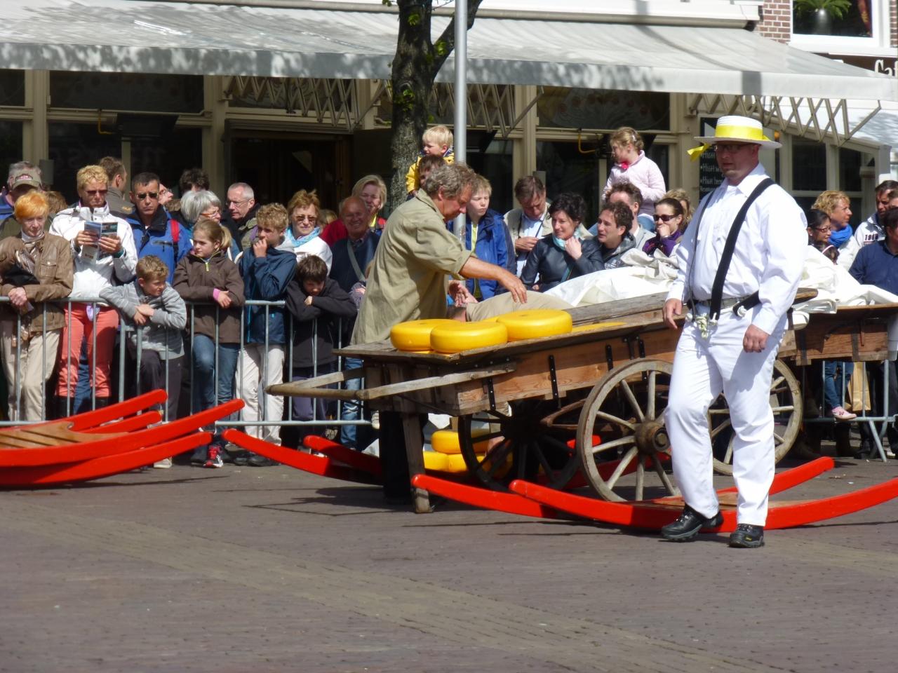チーズ市のチーズ運びの準備中。さらにチーズを並べています。