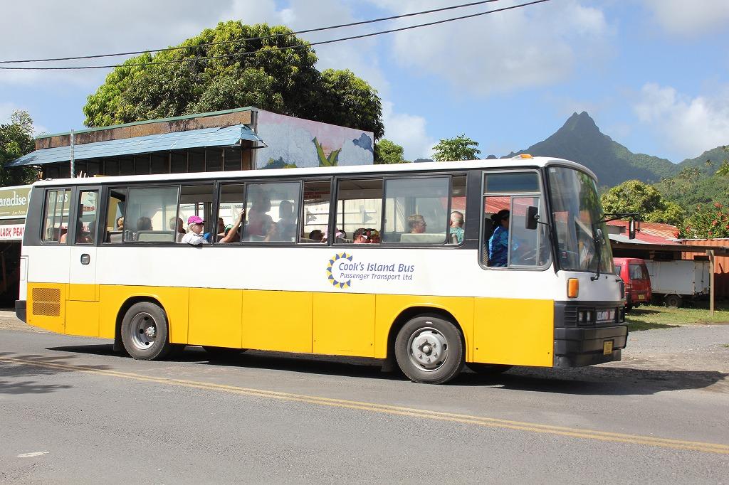 クック諸島を約1時間かけて回るバス、1乗車5NZ$です。どこまで乗っても同じ値段です。日本の中古でした。