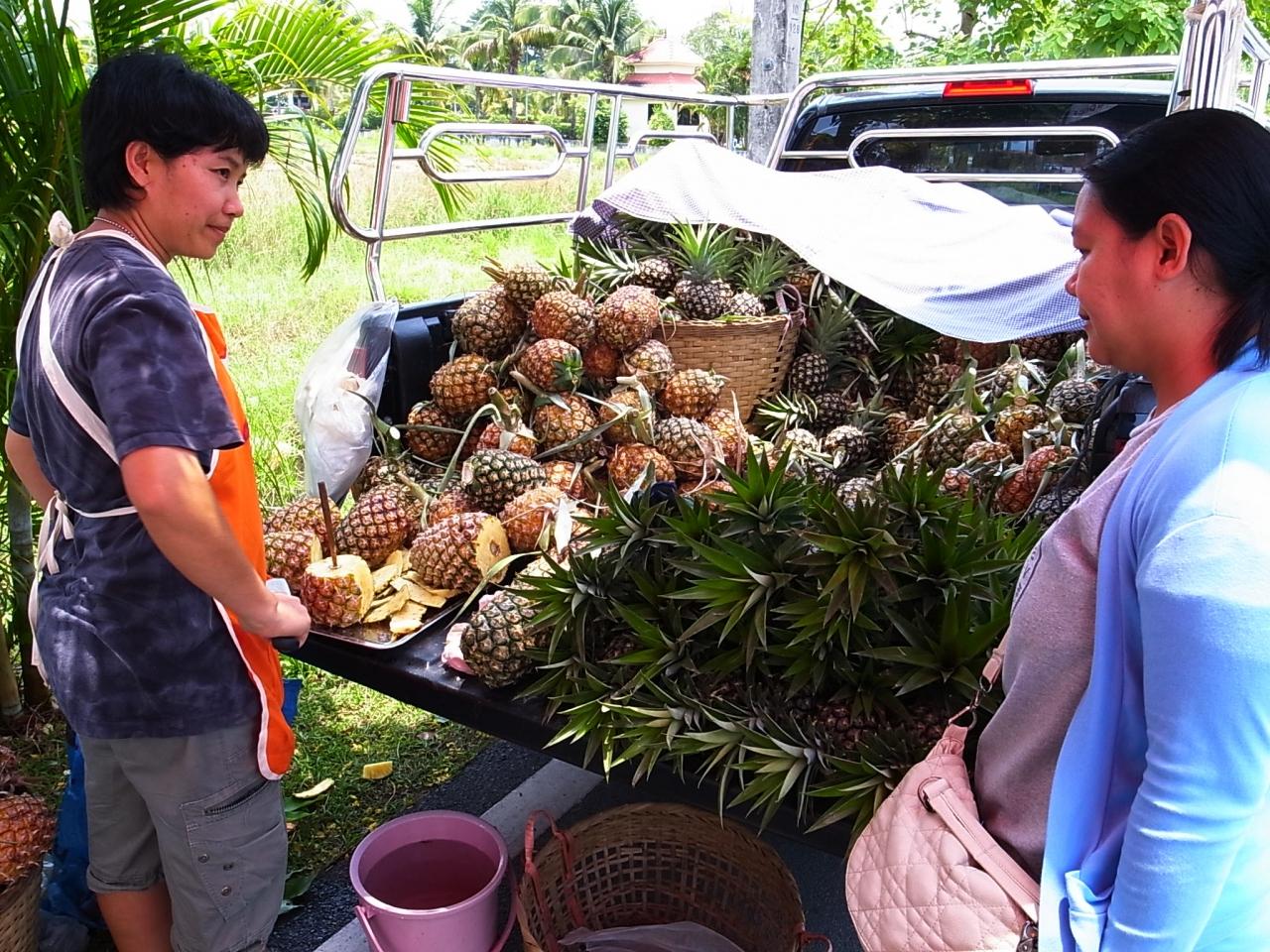 近所の道端でトラックに積んだパイナップルを売っていたので買ってみた。