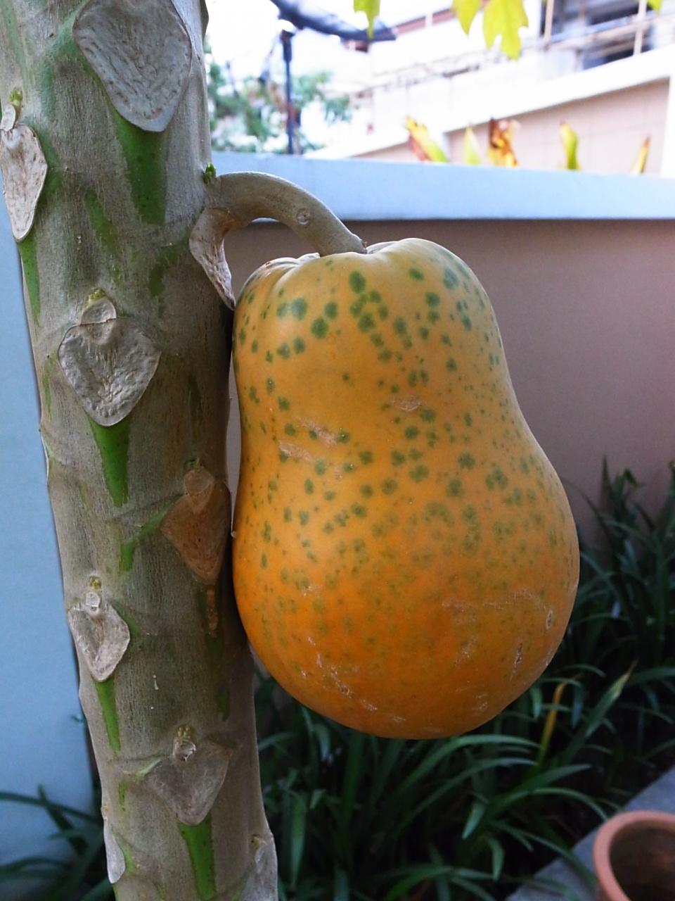 家の庭に生っていたパパイアが黄色く色づいて食べごろになった。