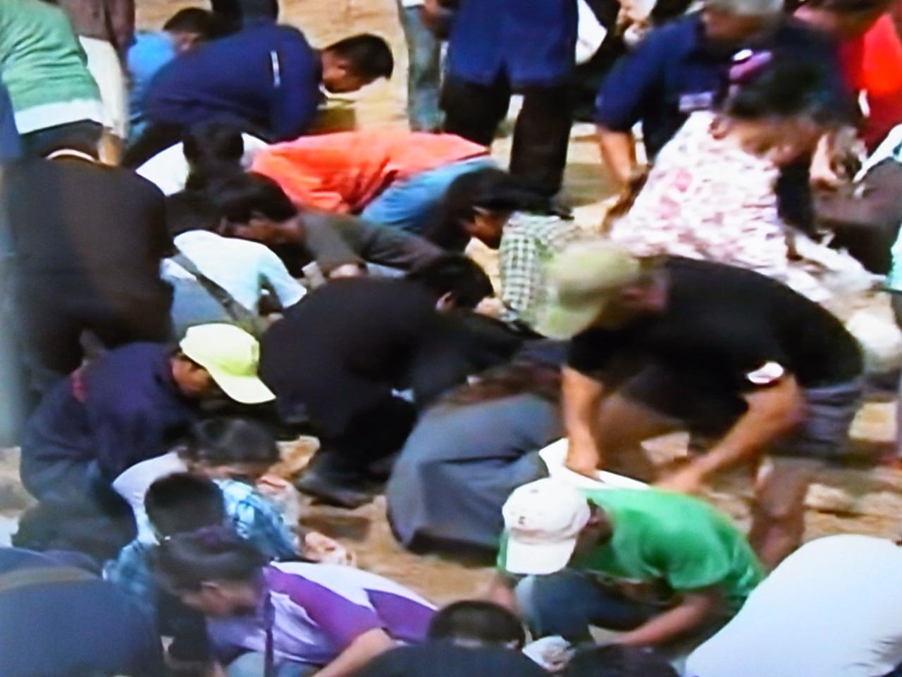 我先にと籾を拾い集める人々。