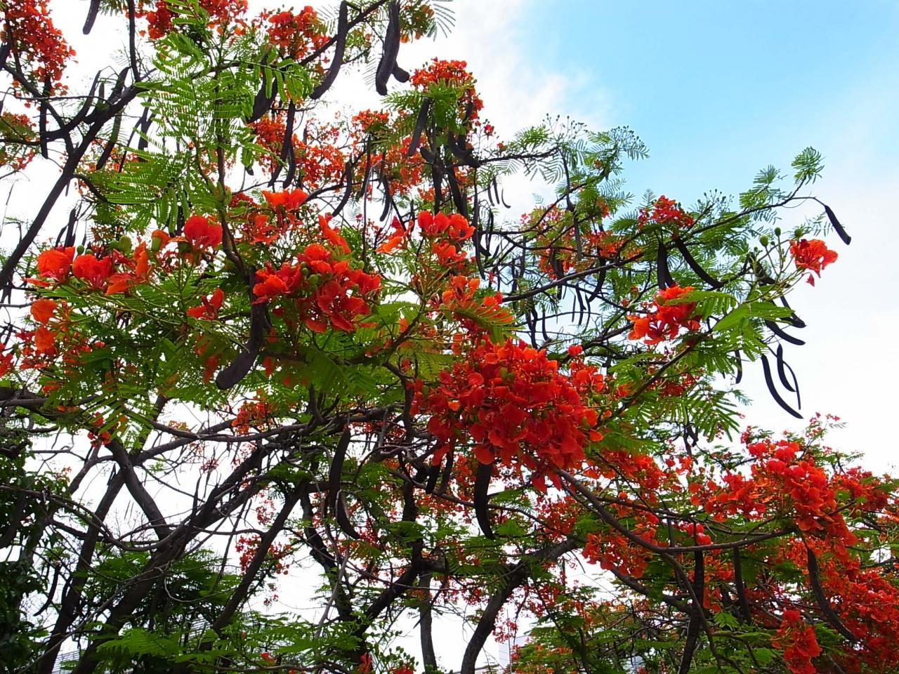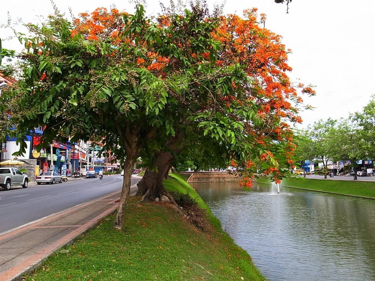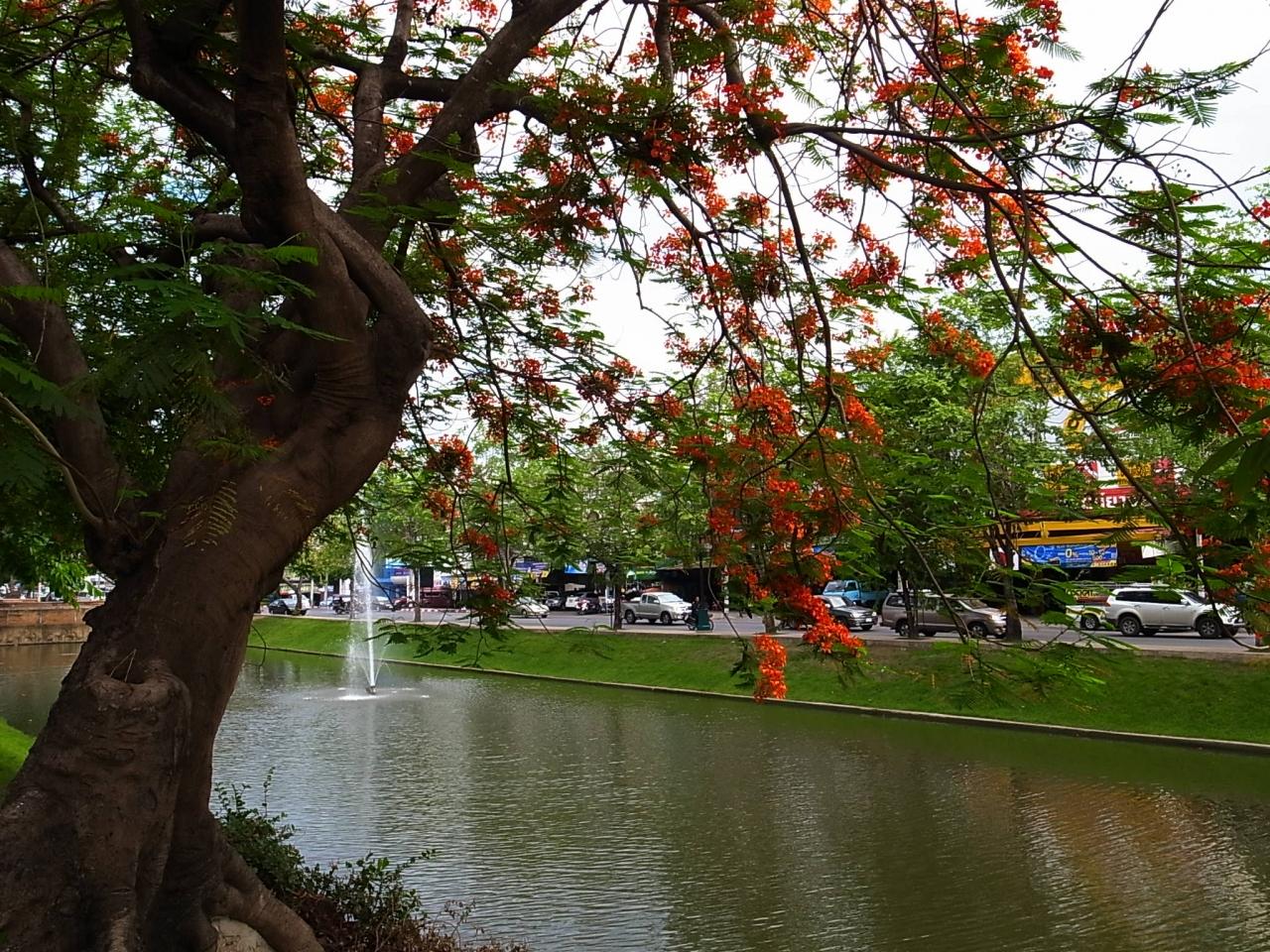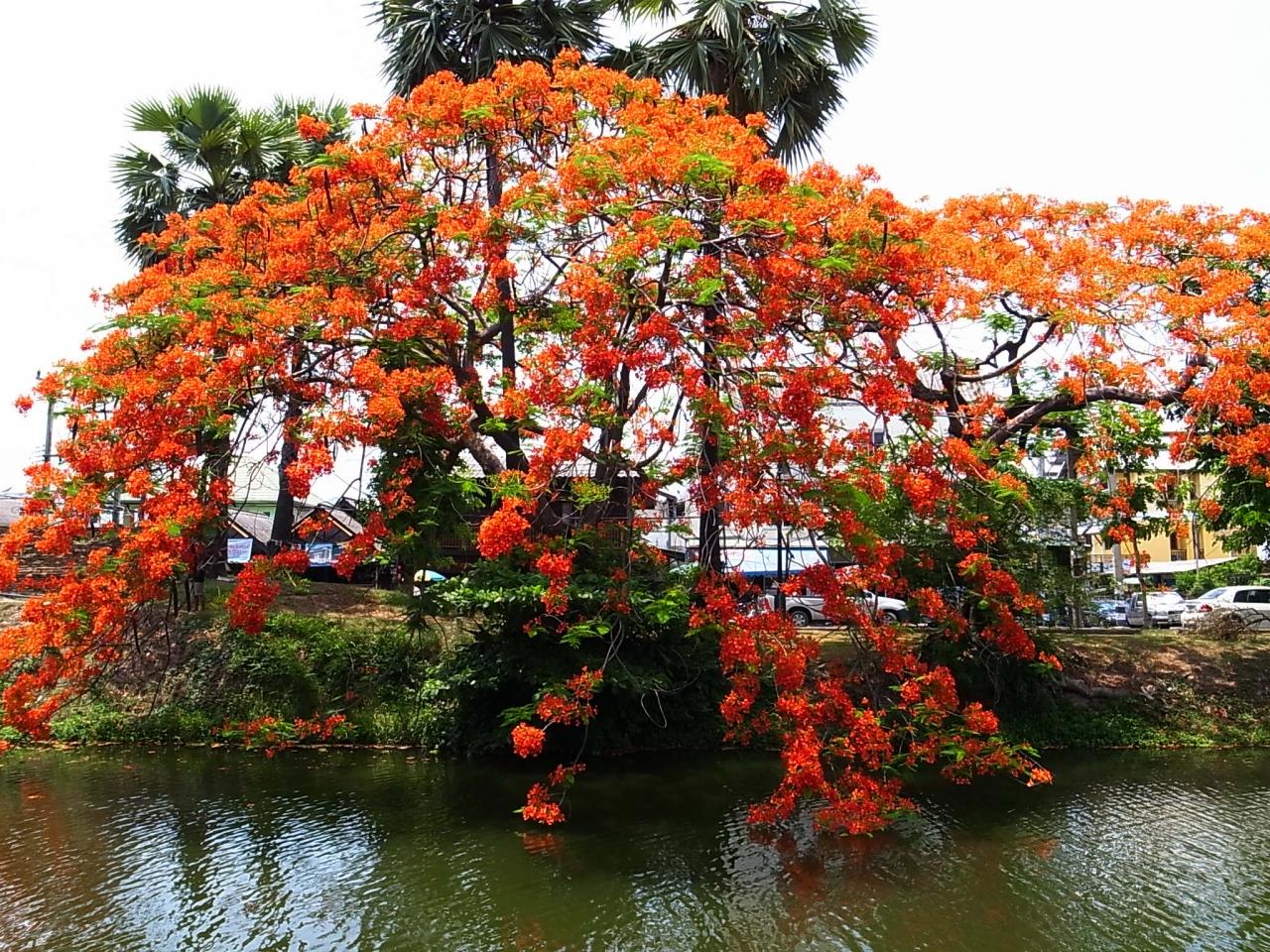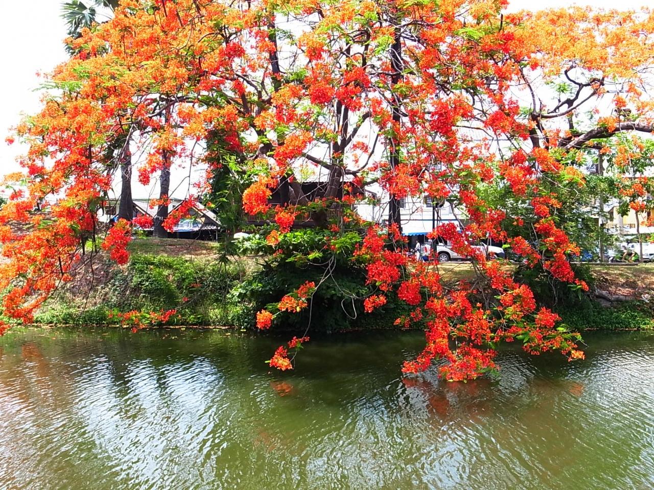 市内に通っている時にしばしば見かけたお堀に咲く火焔樹。