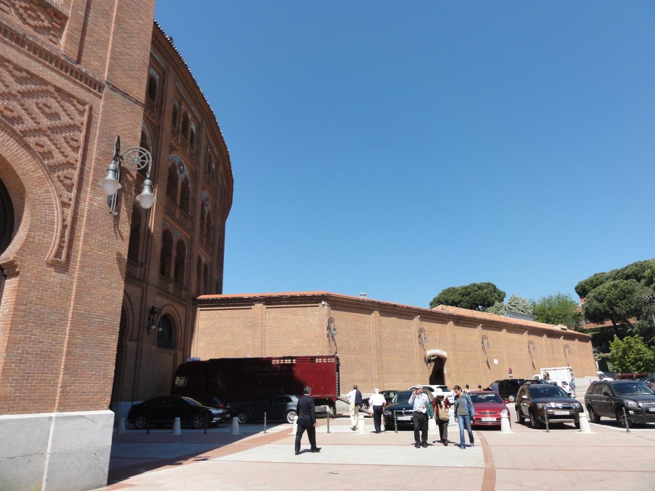 夕方の闘牛に出場する牛を見るためだとは想像つくものの、入場制限があるのか分からない。よく見ると、皆チケットを握っている。ほとんどは闘牛愛好者のおじさんたちだけど、外国人観光客も混ざっている。チケット買わなきゃいけないなら、間に合わないな・・・と思いながら正面ファサードの方に引き返し、売り場で駄目もとで「今そっちから来たんだけど、まだ人入っていた」と聞いてみたら、「いつもは12時5分過ぎたらもう売らないんだけどね」とチケット売ってくれた。たったの1ユーロ。走って厩舎に戻り、中に入れた。 -