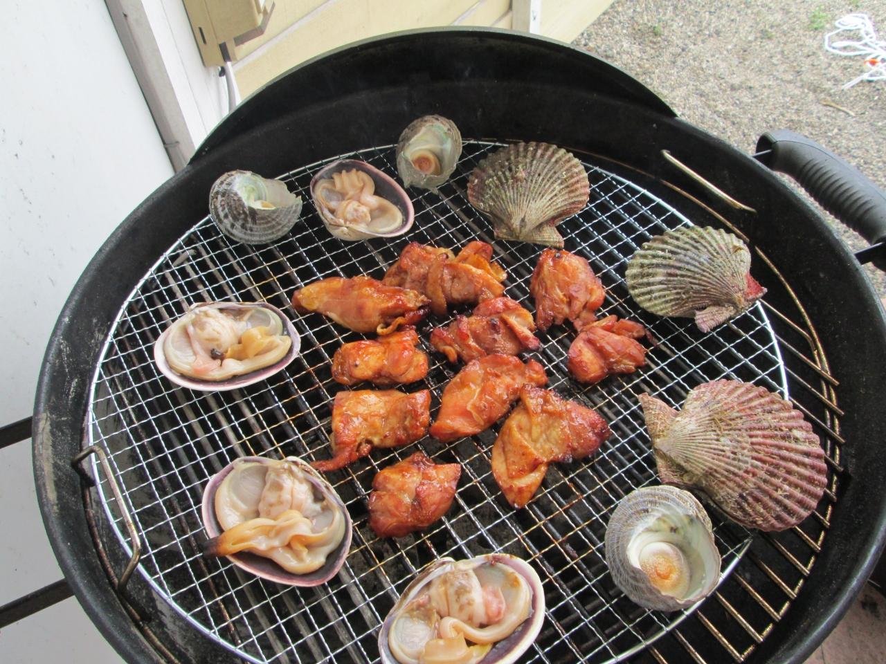 おなかにコーラ(またはビール)をいれて、BBGグリルで1時間くらい焼きます。 -