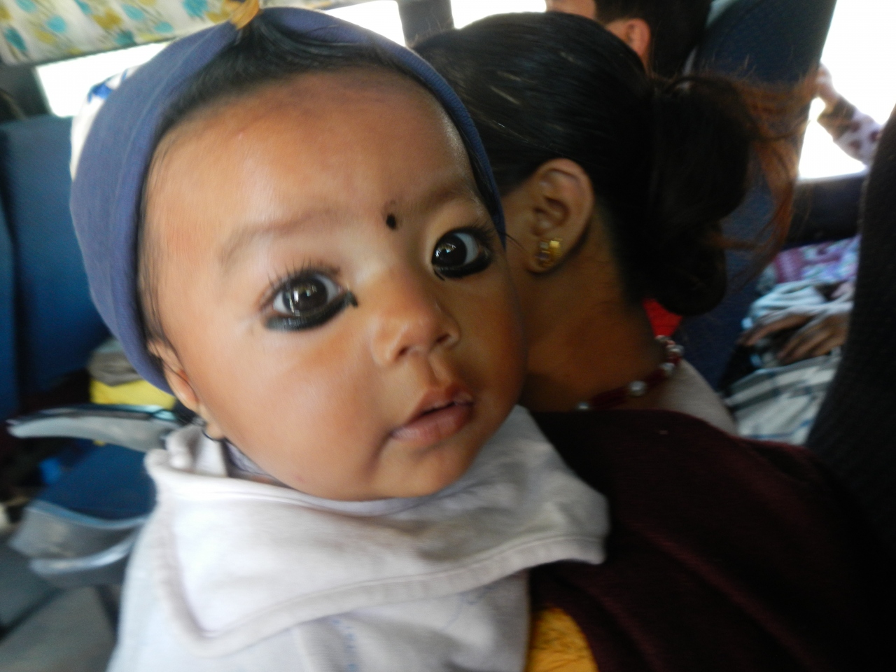 名立たる世界峰々に囲まれた首都カトマンドゥ、タイムトンネルで少しだけ時をさかのぼりして温かい懐かしい裏通りで甘いジェリを食べながら散策。(悪魔よけ黒い縁どり赤ちゃん、ナガルコットへバス内で)