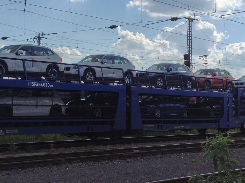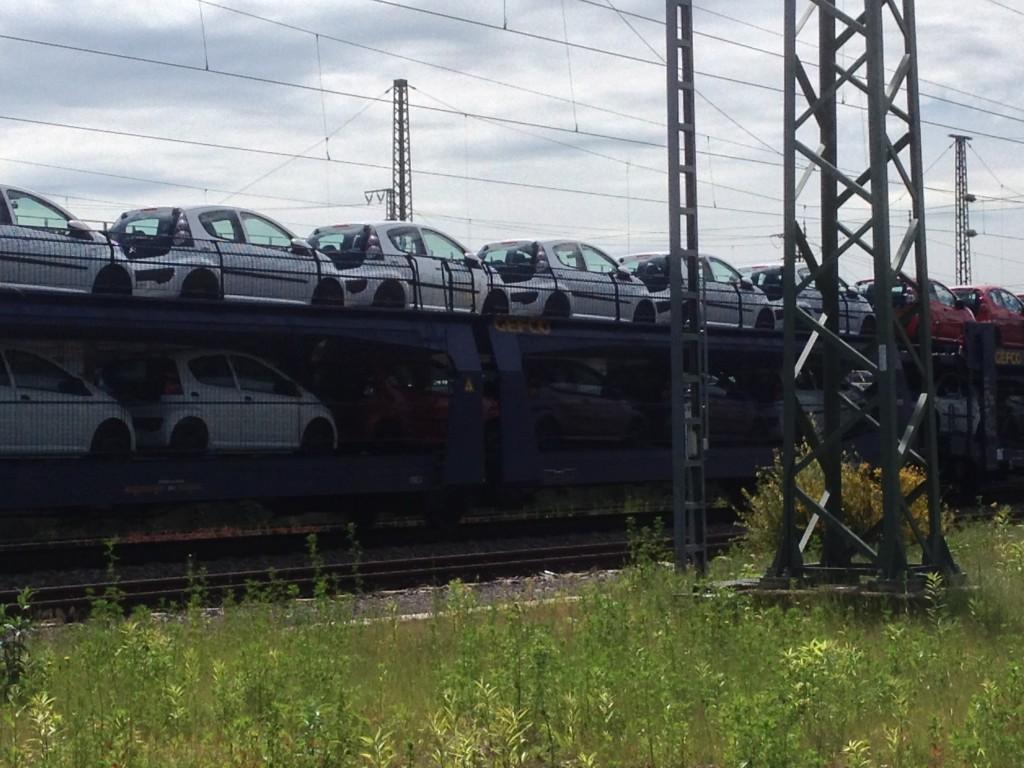 貨物で車の輸送中。カバーとか無いのね。 -