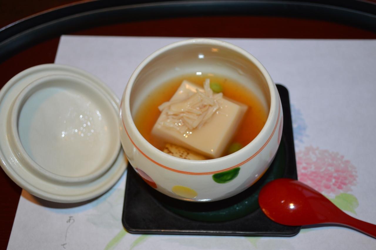 温物 胡麻豆腐に巻湯葉、貝柱でべっ甲飴のお出汁でいただきます。