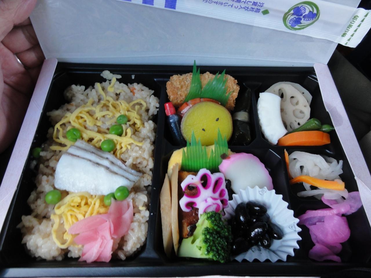 昼食はお茶と弁当が用意され、バス車内で食べる。