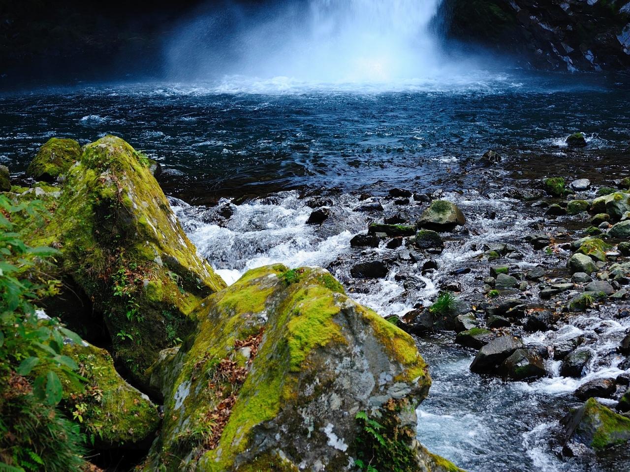 浄蓮の滝の滝つぼ、苔が生えた岩がちょっと気になりました。