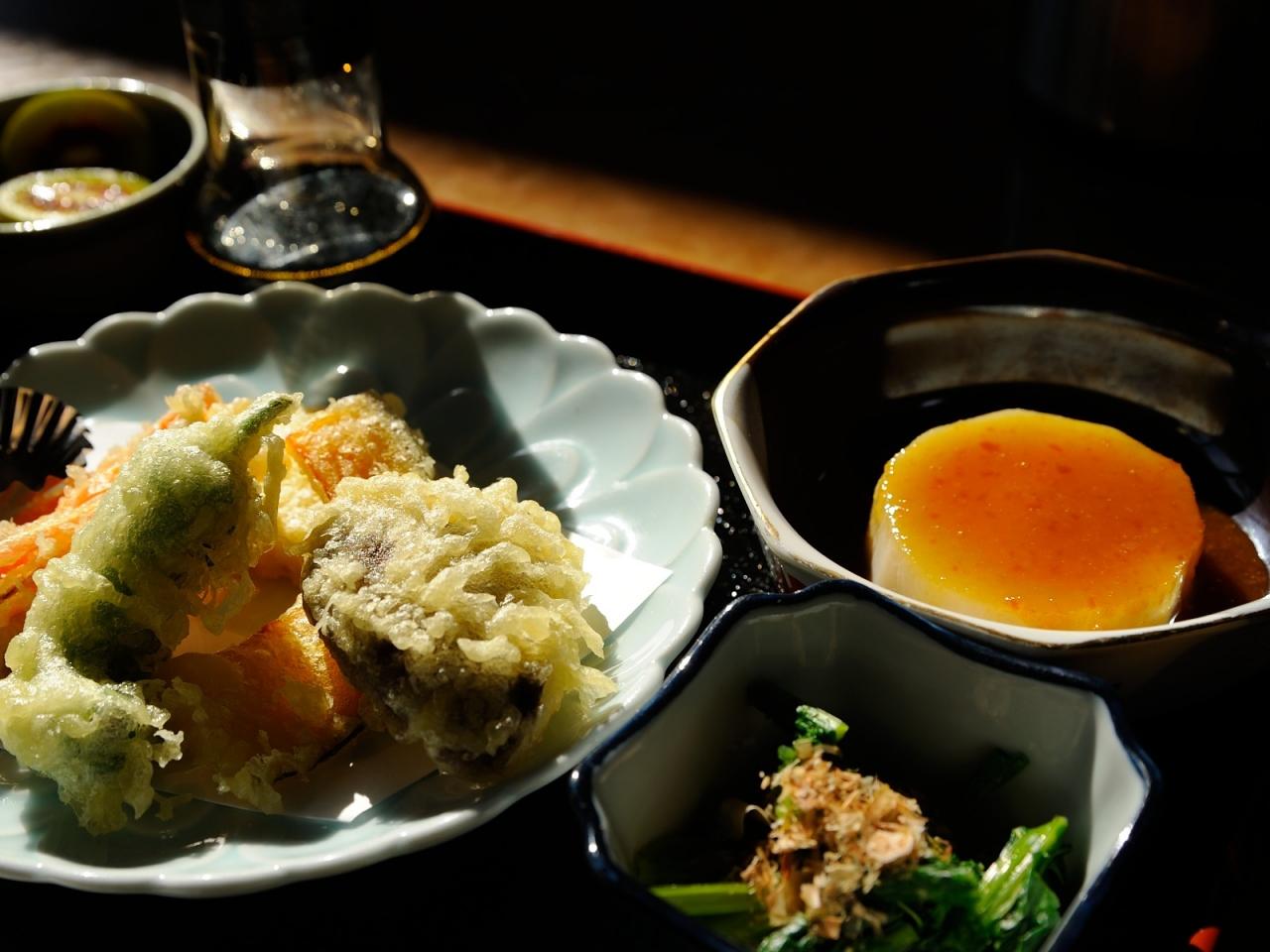 500円ランチは、野菜てんぷら、おひたし、ふろふき大根