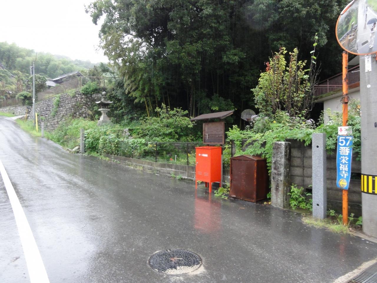 降りると雲の中、三角寺、横峰寺で雨、駐車場から舗装された坂道をどんどん下る。