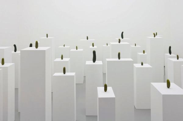 白い立方体の上にピクルスや生のきゅうりが突っ立っているモチーフがランダムに37個並べてあって、間を通り抜けられます。 -