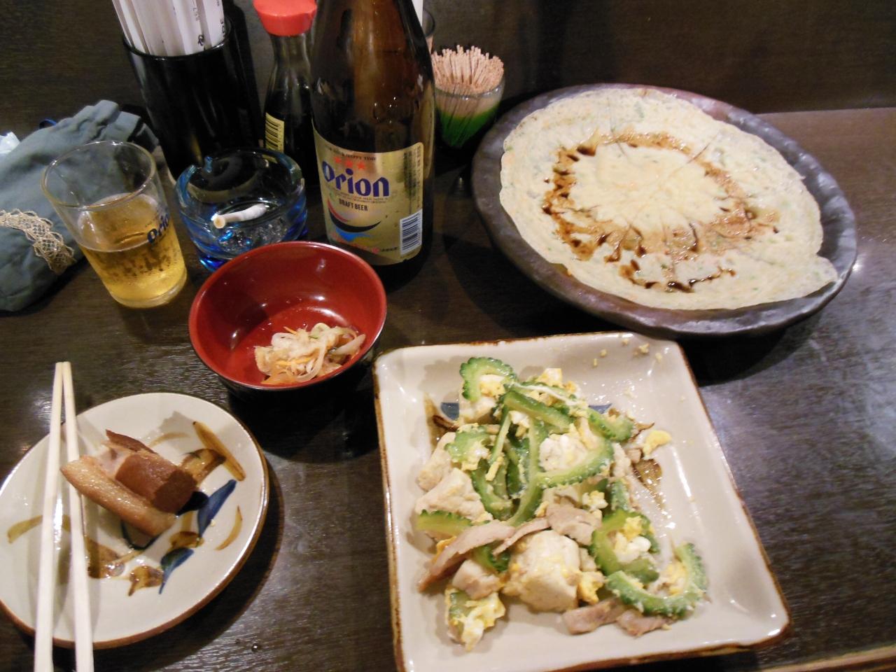 ゴーヤチャンプルー、ラフティ、沖縄風チヂミそしてオリオンビール(*^^*)