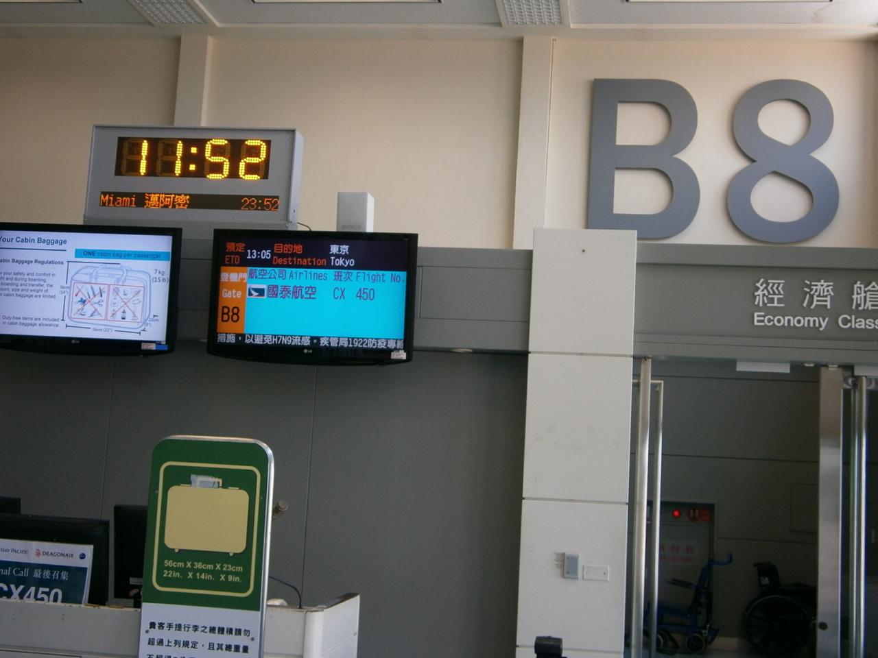 まずは、台湾桃園國際機場第1ターミナルのキャセイ航空のブースにて、チェックイン。機内預け荷物の手続きだけと思い、前日にオンラインチェックインした座席がなく、ひとつ後ろの席を指定されました。A343機材からB777-300機材に変更されたためです。