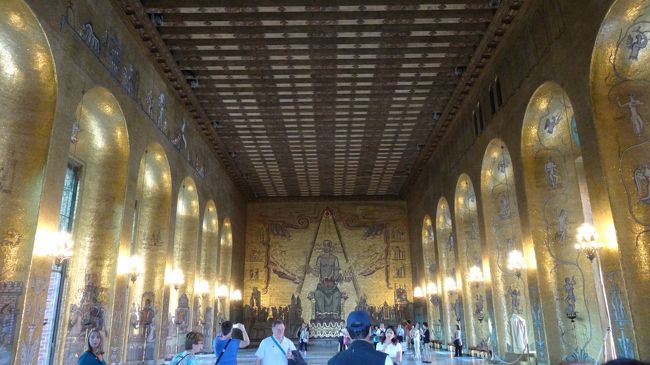 ストックホルム市庁舎は中央駅からのんびり歩いて20分。川沿いの遊歩道ではカヌーに興じる市民も眺めることができます。ちなみに立って乗るカヌー?も流行っているのか、水着を着た女性を何人か見ました。