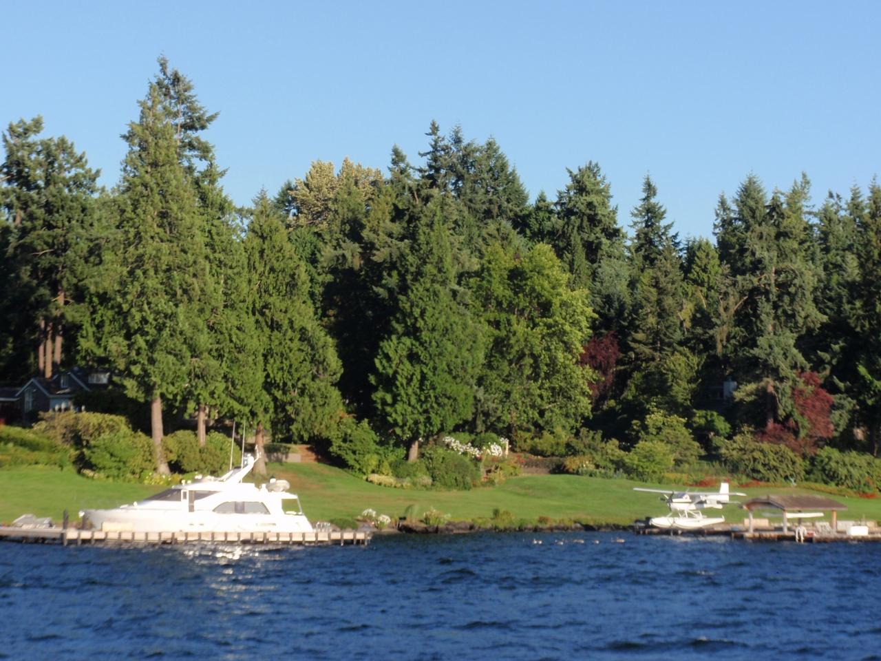 Kirklandの波止場から出るロイヤルアゴシーのディナークルーズに乗りました。左手に、遠くタコマ富士(Mt.Reiner)を見ながら船は進みます。両岸には、マイ・クルーザーや、マイ・水上飛行機を持つ家が、ちらほら。しばらく進むと、右手にワシントン大学のフットボール場(ハスキースタジアム)が見えてきます。大学の施設なのですが、とてもリッパです。跳ね橋を2つ過ぎ、ユニオン湖へ入ります。シアトルを一望することができます。少し離れて、スペースニードルも。通常は、太平洋側から見ることが多いのですが、これは、反対側からで、「裏シアトル」と言った感じです。この後、シップ運河、チッテンデン水門を経由して、エリオット湾に出るコースもあるのですが(数年前経験)、今回は、ここで、Uターン。揺れもなく、3時間ほどの快適なクルーズでした。