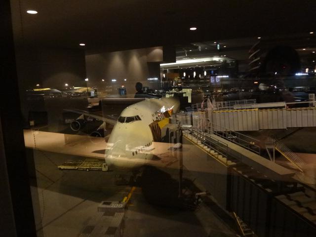 ガラス越しで見難いですがホノルル行きのジャンボです