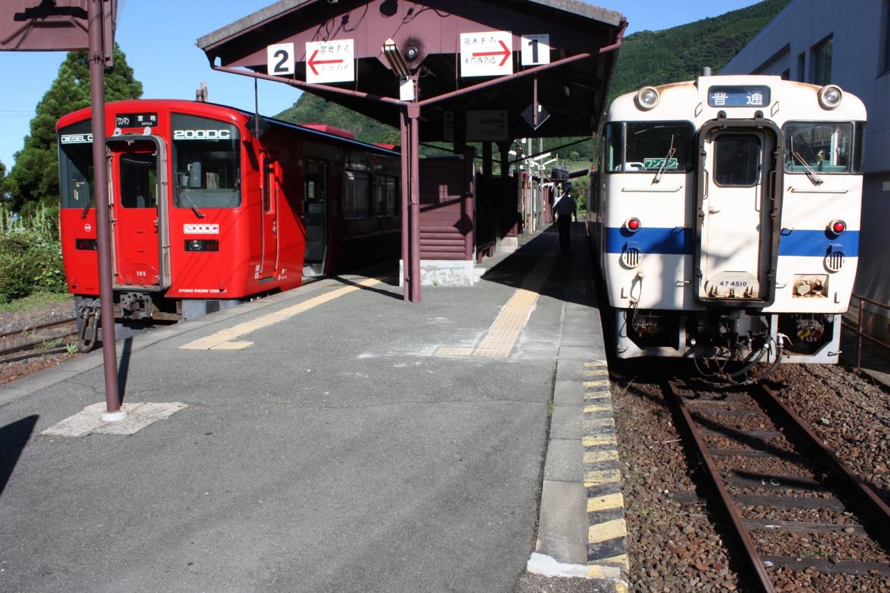 阿蘇駅に停車中の豊肥本線の上下の普通列車。