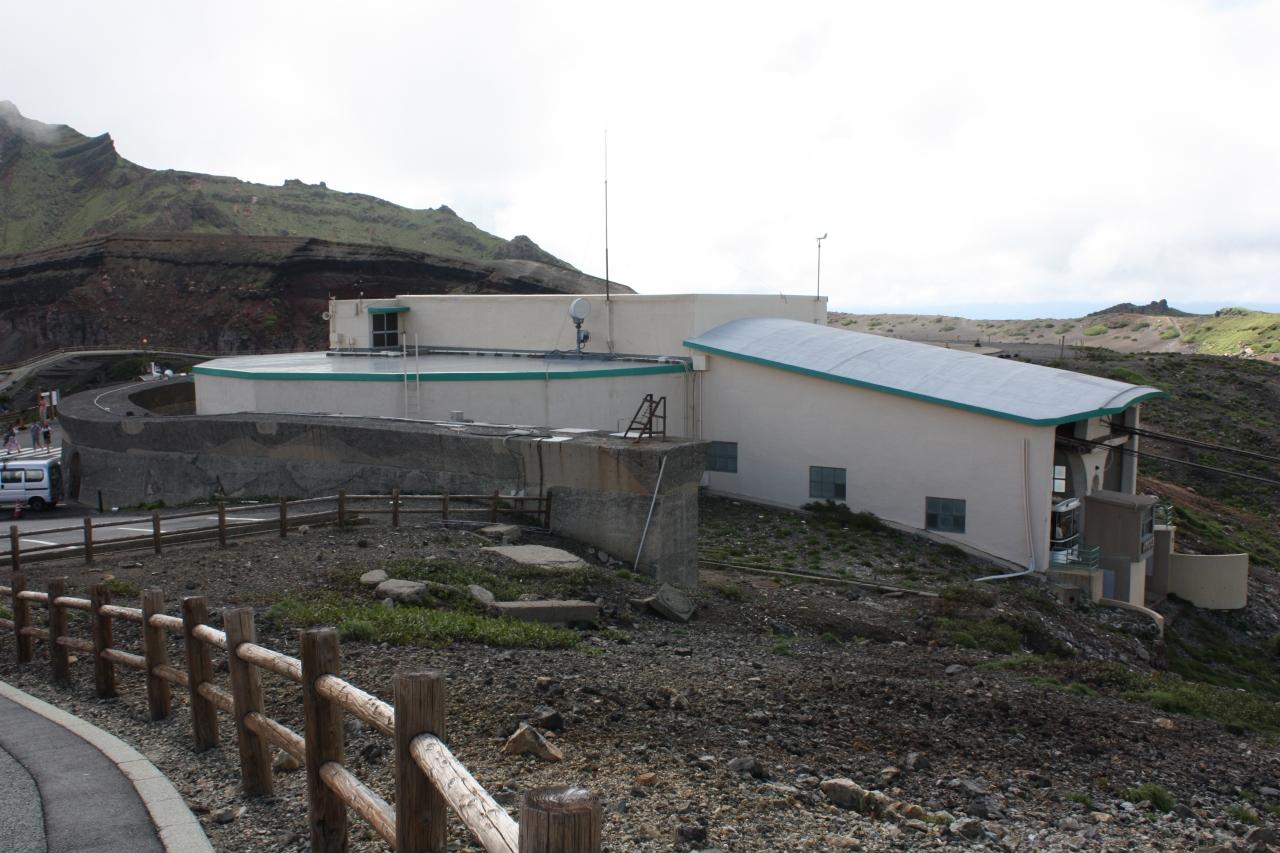 往復乗車券を買い、ロープウエイに乗りました。混み合いました。風が強かったので徐行運転でしたが、5分弱で火口駅に着きました。 -