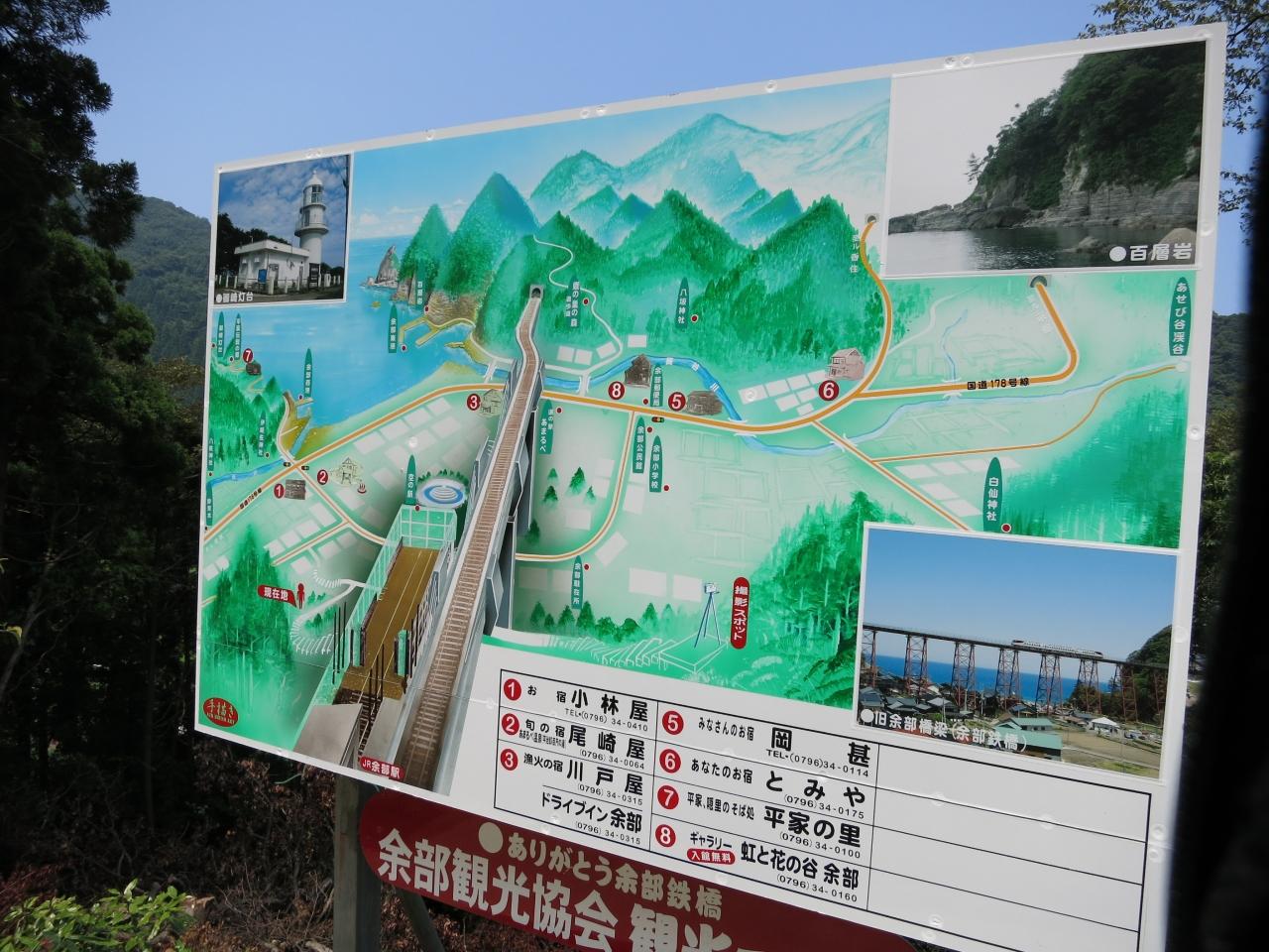 この案内看板でよく分かりますが、軌道の下の方が鳥取方向、上の方が京都方向になり、軌道の左にあるのが旧橋梁を活用した展望施設で、本線は京都側で軌道がオフセットしているのがよく分かると思います.この部分が最終的に軌道を切り替えて完成させた部分になります.